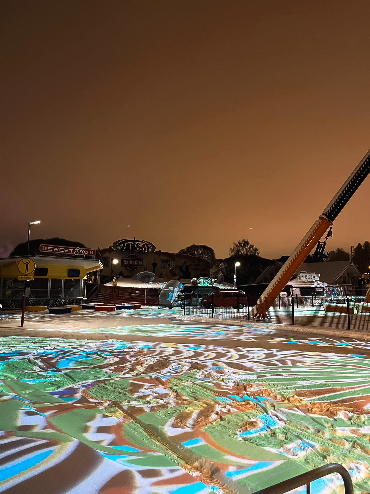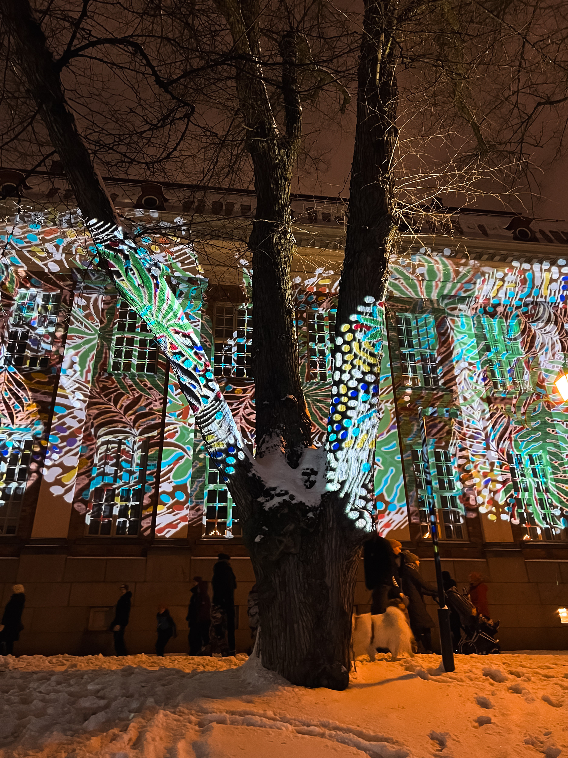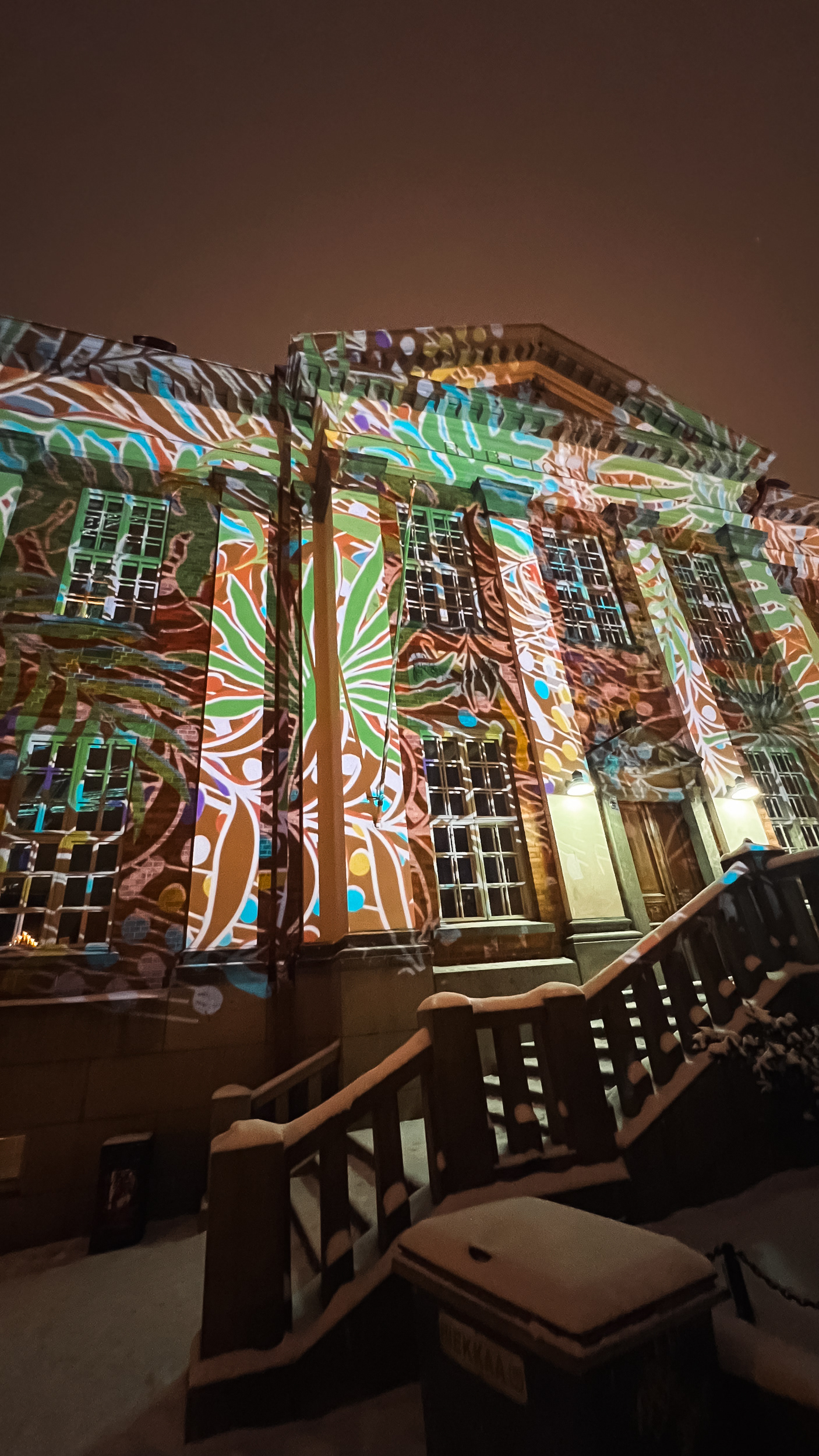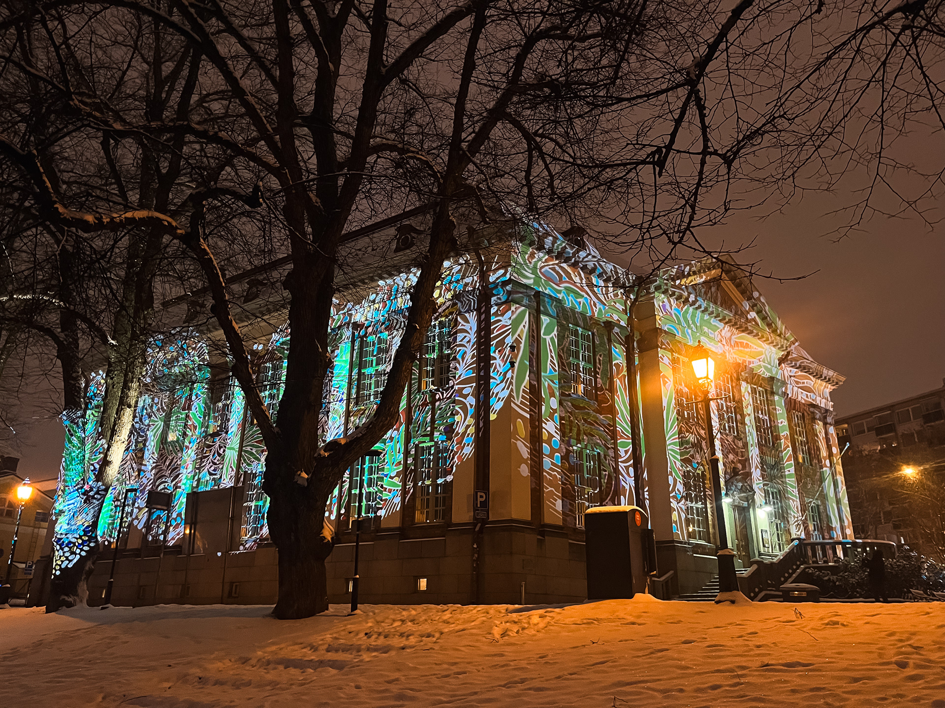 Large scale projection onto the botanical garden in Joensuu during the visualfestival, the old library in Turku during the path of light festival and the floor of the amusement park Särkänniemi in Tampere during Valkea 2023 - light and art festival.