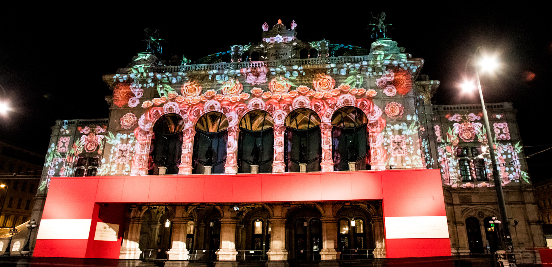 Digital projection onto the facade of the Opera of Vienna during the Opera Ball in 2019, on occasion of the